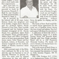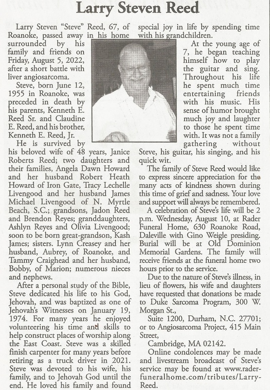 - Larry Steven "Steve" Reed was born in 1955 in Roanoke to Kenneth E. Reed Sr. and Claudine E. Reed. Larry married Janice Roberts Reed. They had two children, Angela Dawn Howard and Tracy Lechelle Livengood. Larry Reed died on August 5, 2022, and is buried in Old Dominion Memorial Gardens. He lived in Roanoke, Virginia.