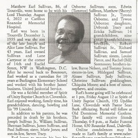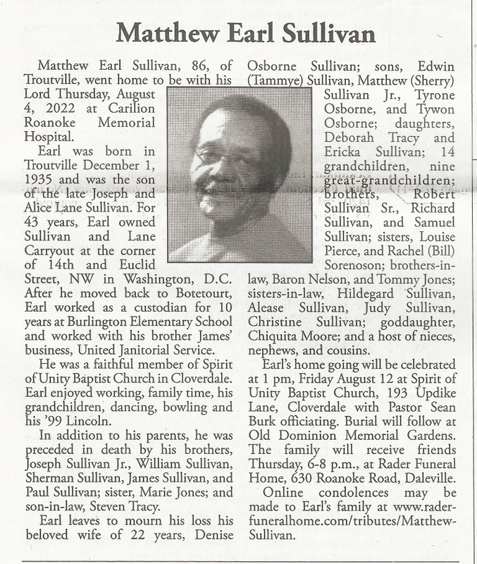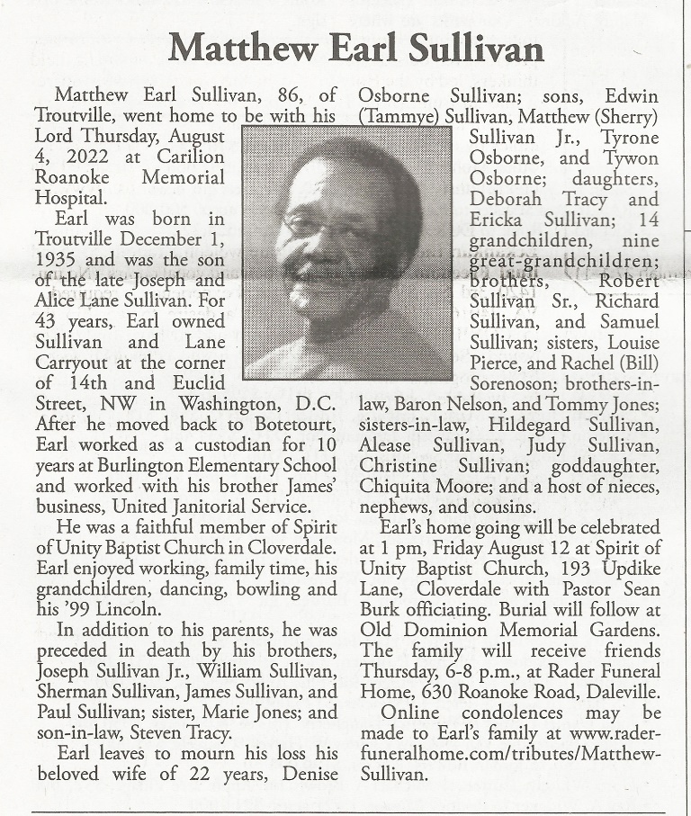 - Matthew Sullivan was born in 1935 in Troutville to Joseph and Alice Lane Sullivan. He married Denise Osborne Sullivan. He had six children: Edwin, Matthew Jr., Tyrone Osborne, Tywon Osborne, Deborah Tracey, and Ericka Sullivan. Matthew Sullivan died on August 4, 2022, and is buried in Old Dominion Memorial Gardens. He lived in Troutville.
