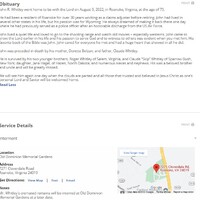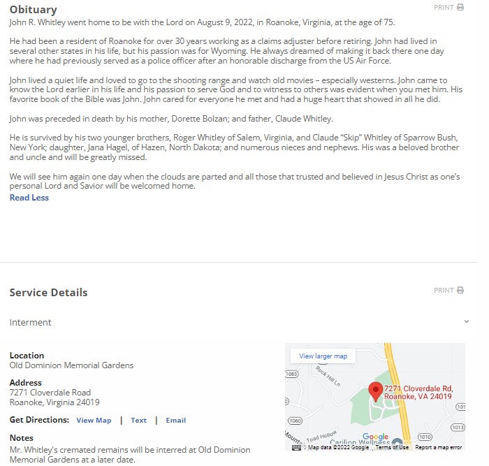 - John Whitley was born in 1947 to Dorette Bolzan and Claude Whitley. He had one child, Jana Hagel. John Whitley died on August 9, 2022, and his internment was at Old Dominion Memorial Gardens. He lived in Roanoke, Virginia.