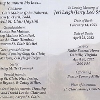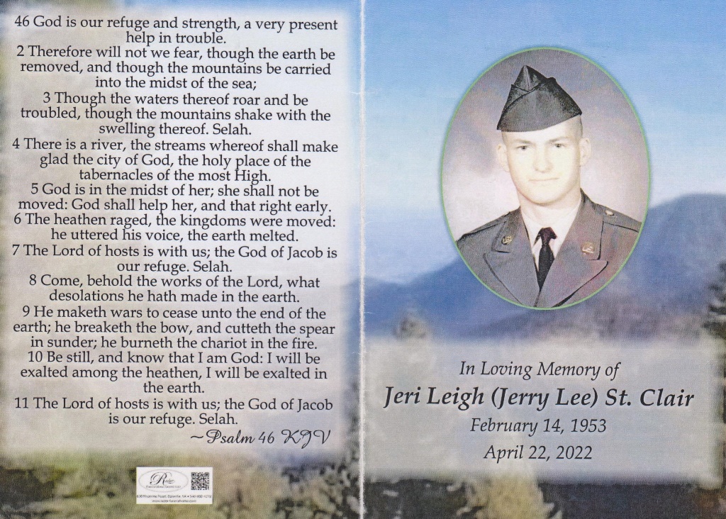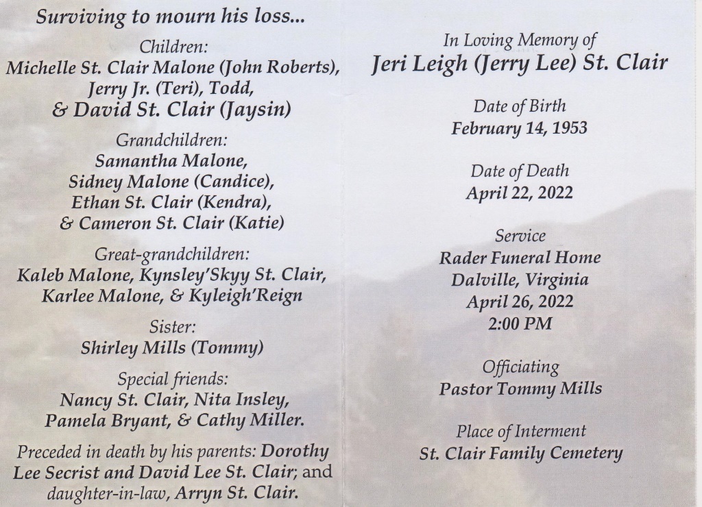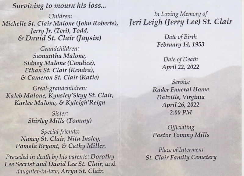 - Jeri Leigh "Jerry Lee" was born in 1953 to Dorothy Lee Secrist and David Lee St. Clair. He has three children: Michelle St. Clair Malone, Jerry Jr., and David. Jeri Leigh died on April 22, 2022, and is buried in St. Clair Family Cemetery. He lived in Troutville