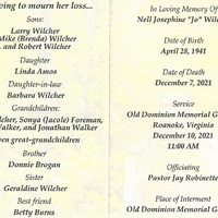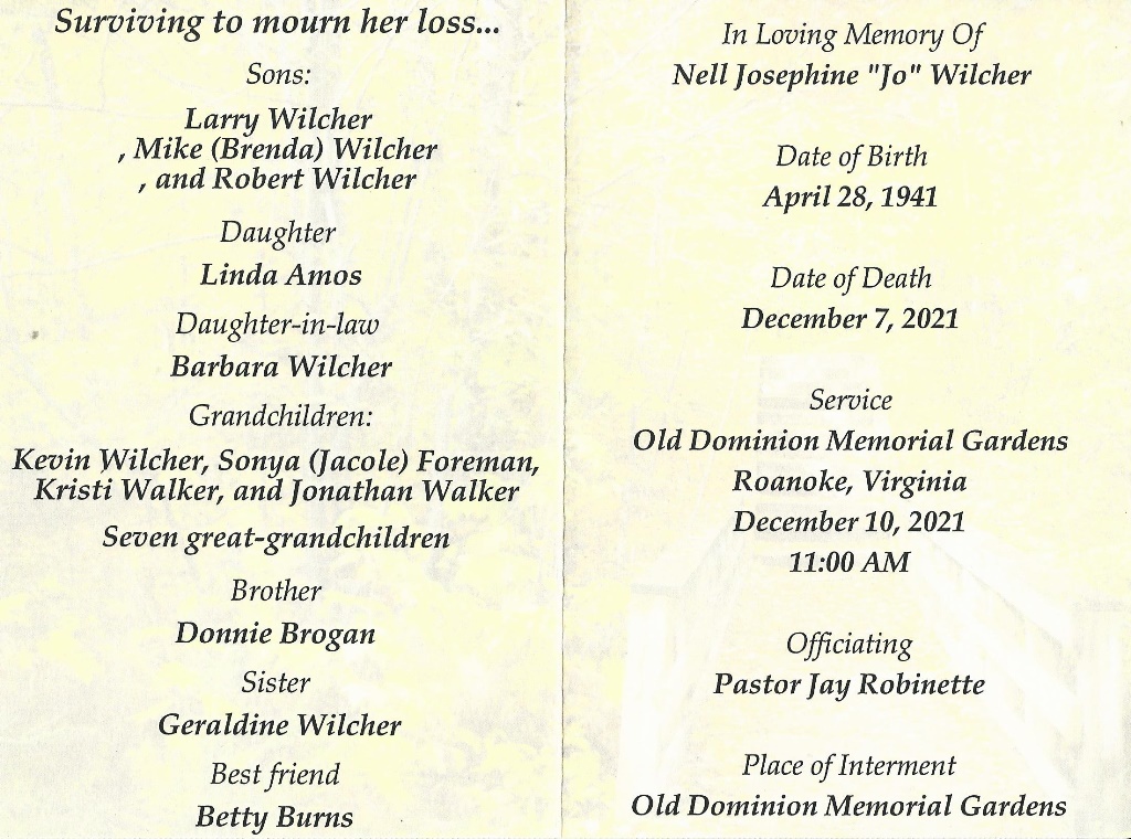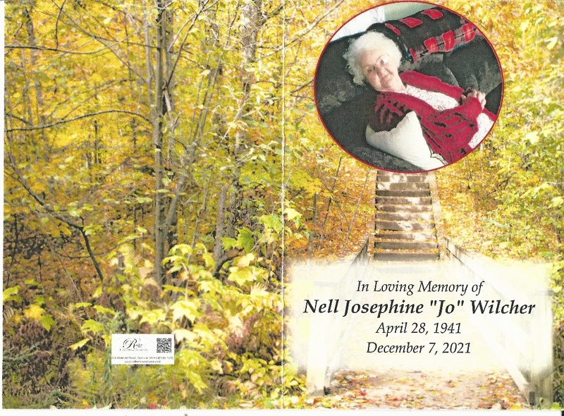 - Nell Josephine "Jo" Wilcher was born in 1941 in Fredericksburg, Virginia to William and Mattie Dunbar Brogan. She married Preston H. Wilcher and had four children: Larry, Mike, Robert, and Linda Amos. Nell Wilcher died on December 7, 2021, and is buried in Old Dominion Memorial Gardens. She lived in Buchanan.