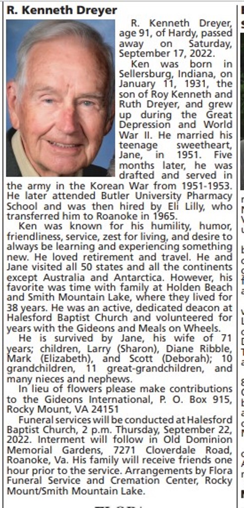 - R. Kenneth Dreyer was born in 1931 to Roy Kenneth and Ruth Dreyer. He married Jane in 1951. They had four children: Larry, Diane Ribble, Mark, and Scott. R. Kenneth Dreyer died on September 17, 2022, and is buried in Old Dominion Memorial Gardens. He lived in Hardy, Virginia