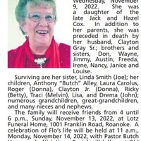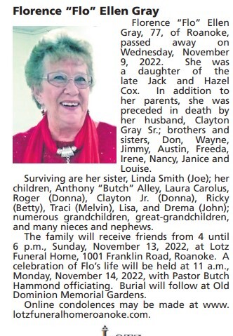 - Florence "Flo" Gray was born to Jack and Hazel Cox. She married Clayton Gray Sr. They had eight children: Anthony "Butch" Alley, Laura Carolus, Roger, Clayton Jr., Ricky, Traci, Lisa, and Drema. Florence Gray died on November 9, 2022, and is buried in Old Dominion Memorial Gardens. She lived in Roanoke.