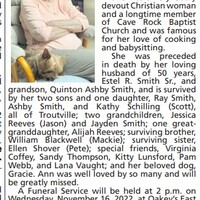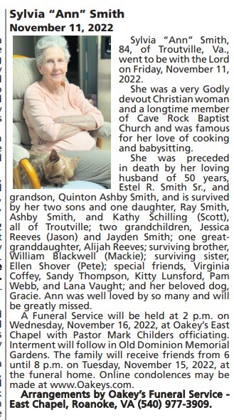 - Sylvia "Ann" Smith married to the late Estel R. Smith Sr. They had three children: Ray, Ashby, and Kathy Schilling. Sylvia Smith died on November 11, 2022, and is buried in Old Dominion Memorial Gardens. She lived in Troutville.