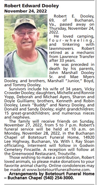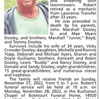 - Robert Dooley was born in 1953 to John Marshall Sr. and Mae Myers Dooley. He married Vicky Crowder Dooley. They had three children: Michelle Yopp, Deborah Ayers, and Sharon Guilliams. Robert Dooley died on November 24, 2022, and is buried in Godwin Cemetery. He lived in Buchanan.
