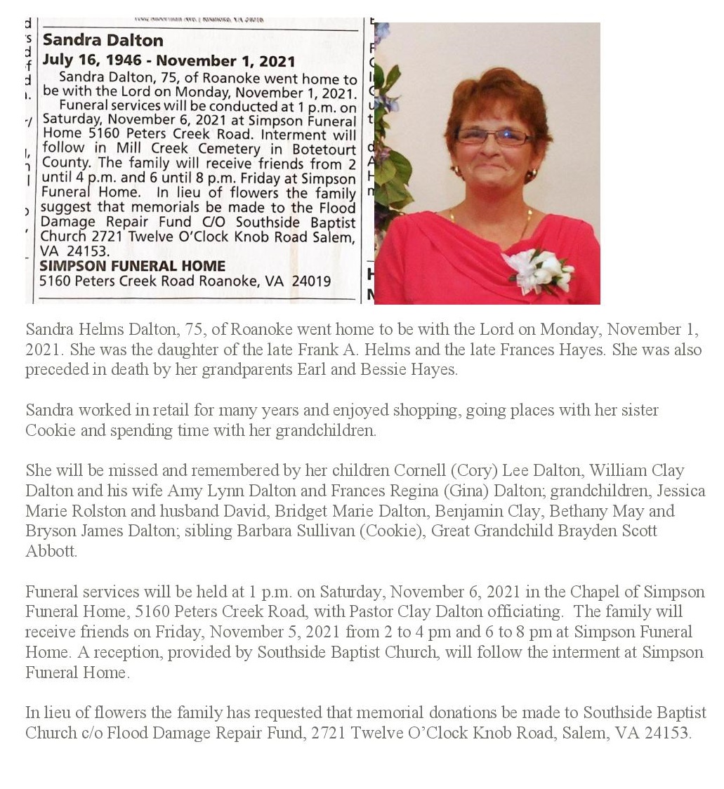 - Sandra Dalton was born in 1946 to Frank A. Helms and Frances Hayes. She had three children: Cornell (Cory Lee Dalton, William Clay Dalton, and Frances Regina (Gina) Dalton. Sandra Dalton died in 2021 and was buried in the Mill Creek Cemetery. She lived in Roanoke.