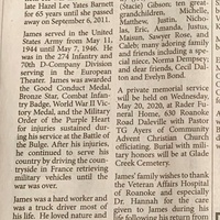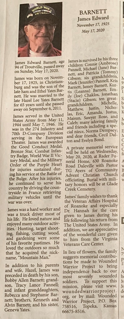 - James Barnett was born in 1925 in Christiansburg to Sam and Ethel Yates Barnett. He married Hazel Lee Yates Barnett. They had four children: Bobby Allen Barnett, Connie Pannell, Michael Barnett, and Patricia Gibson. James Barnett died on May 17, 2020, and is buried in Glade Creek Cemetery. He lived in Troutville.