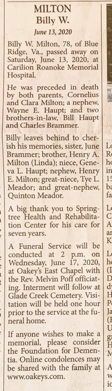 - Billy Milton was born to Cornelius and Clara Milton. Billy Milton died on June 13, 2020, and is buried in Glade Creek Cemetery. He lived in Blue Ridge.