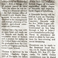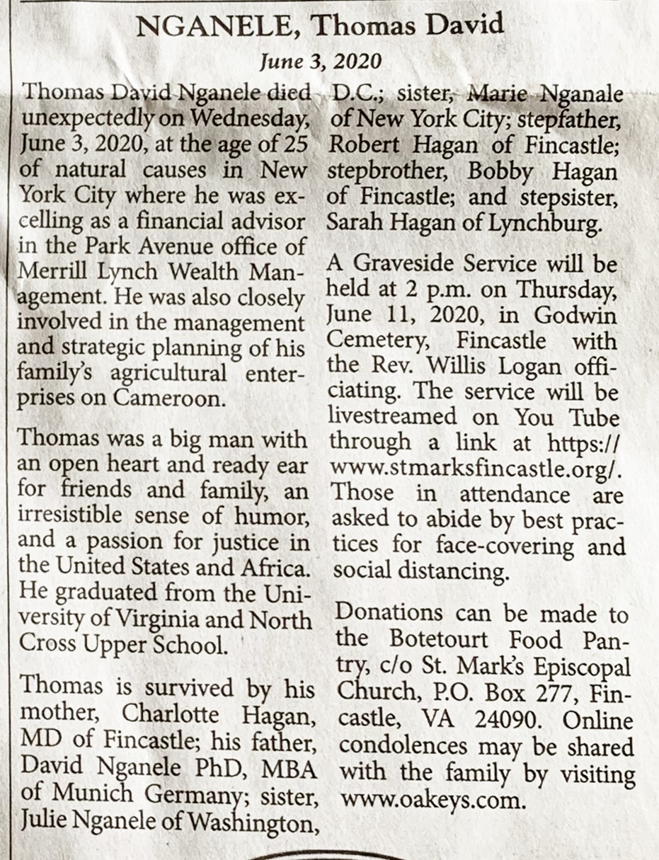 - Thomas Nganele was born to Charlotte Hagan and David Nganele. Thomas Nganele died on June 3, 2020, and is buried in Godwin Cemetery. He was living in New York City at the time of his death.