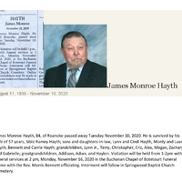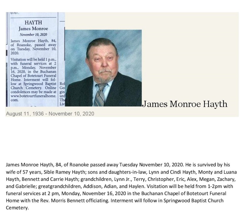 - James Hayth was born in 1936. He married Sible Ramey Hayth. They had three children: Lynn, Monty, and Bennett. James Hayth died November 10, 2020, and is buried in Springwood Baptist Church Cemetery. He lived in Roanoke.