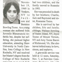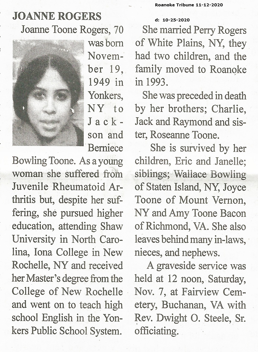 - Joanne Rogers was born in 1949 in Yonkers, New York to Jackson and Berniece Bowling Toone. She married Perry Rogers. They had two children, Eric and Janelle. Joanne Rogers died on October 25, 2020, and is buried in Fairview Cemetery.