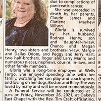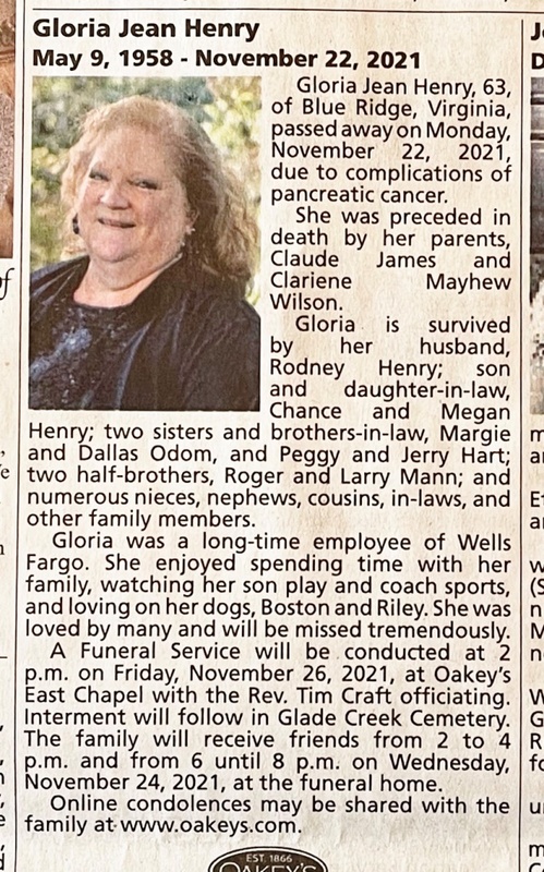 - Gloria Henry was born in 1958 in Blue Ridge to Claude James and Clariene Mayhew Wilson. She married Rodney Henry. They had one child, Chance. Gloria Henry died on November 22, 2021, and is buried in Glade Creek Cemetery.