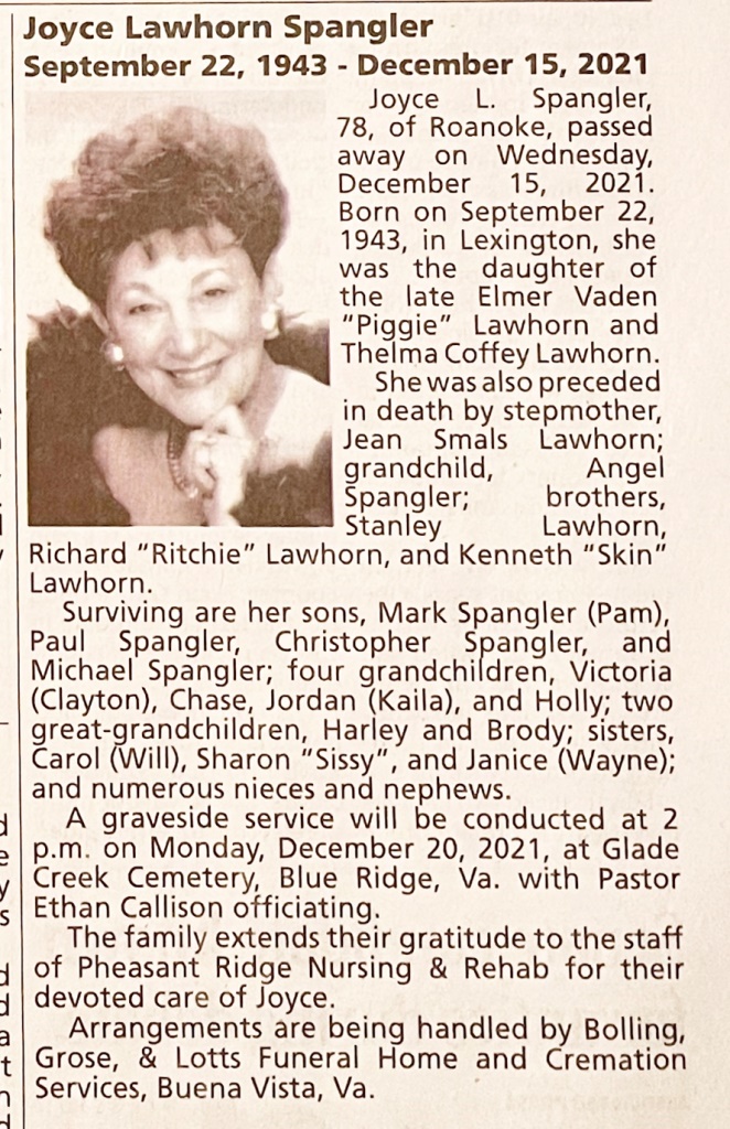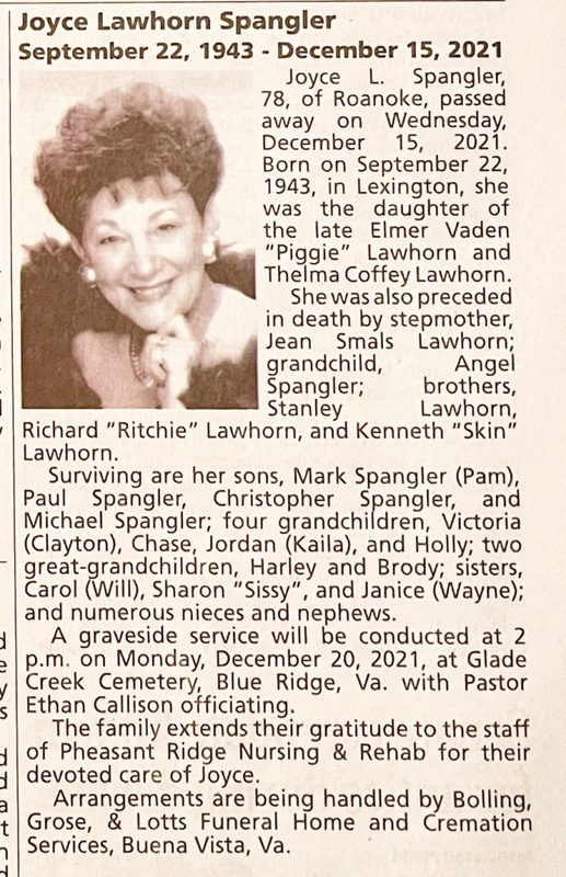 - Joyce Spangler was born in 1943 in Lexington to Elmer Vaden "Piggie" Lawhorn and Thelma Coffey Lawhorn. She had four sons: Mark, Paul, Christopher, and Michael. Joyce Spangler died on December 15, 2021, and is buried in Glade Creek Cemetery. She lived in Roanoke.