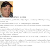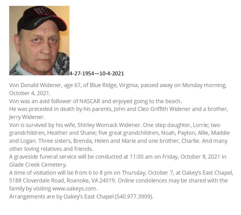 - Von Widener was born in 1954 to John and Cleo Griffith Widener. He was married to Shirley Womack Widener. Von Widener died on October 4, 2021, and is buried in Glade Creek Cemetery. He lived in Blue Ridge.