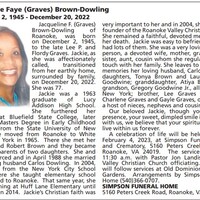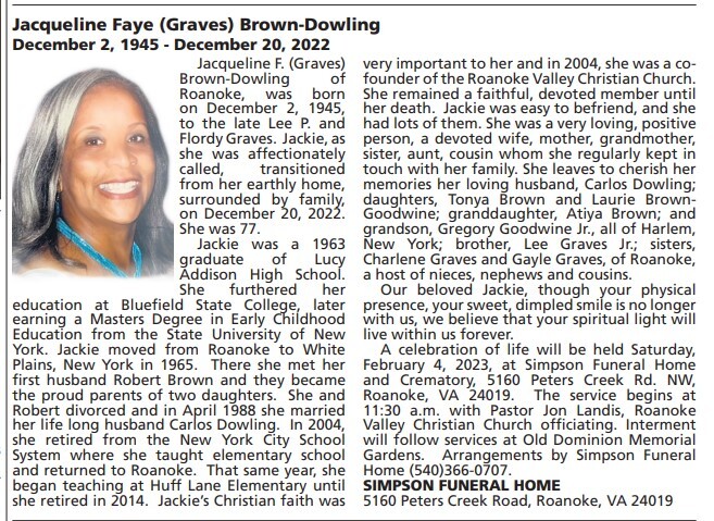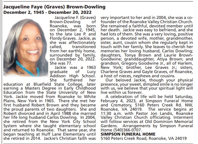 - Jacqueline Faye Brown-Dowling (nee Graves) was born on 1945 to Lee P. Graves and Flordy Graves. She married Robert Brown and had two daughters, Tonya and Laurie. She married Carlos Dowling in 1988. Jacqueline Brown-Dowling died on December 20, 2022, and is buried in Old Dominion Memorial Gardens.