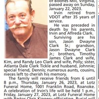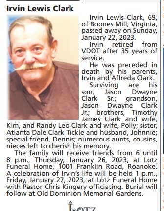 - Irvin Lewis Clark was born to Irvin Clark and Aflreda Clark. He had one son, Jason Dwayne Clark Sr. Irvin Clark died on January 22, 2023, and is buried in Old Dominion Memorial Gardens.