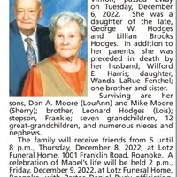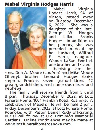 - Mabel Harris was born to George W. Hodges and Lilian Brooks Hodges. She married Wilford E. Harris. They had three children: Wanda LaRue Fenchel, Don A. Moore, and Mike Moore. Mabel Harris died on December 6, 2022, and is buried in Old Dominion Memorial Gardens.