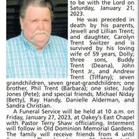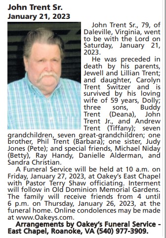- John Trent Sr. was born to Jewell Trent and Lillian Trent. He married Dolly. They had four children together: Carolyn, Buddy, John, and Andrew. John Trent died on January 21, 2023, and is buried in Old Dominion Memorial Gardens. He resided in Daleville at the time of his death.