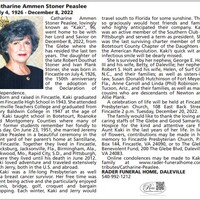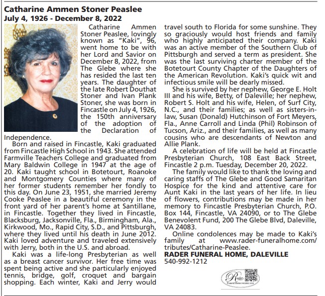 - Catharine "Kaki" Ammen Stoner Peaslee was born in Fincastle in 1926 to Robert Douthat Stoner and Ivan Plank Stoner. She married Jeremy Cooke Peaslee in 1951. Catharine Peaslee died on December 8, 2022, and is buried in Godwin Cemetery.