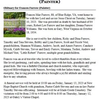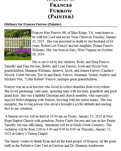 - Frances Furrow (nee Painter) was born in Gary, West Virginia in 1934. She married Robert Lee Farrow. They had 5 children together: Donna Furrow WIlliams, Ricky Furrow, Tina Stevens, Bobby Furrow, and Nicole Vest. Frances Furrow died on January 10, 2023, and is buried in Glade Creek Cemetery. She lived in Blue Ridge at the time of her death.