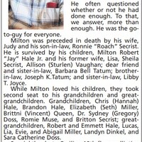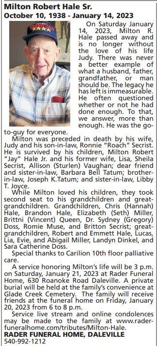- Milton Hale was born in 1938. He married Judy Milton. They had a child, Milton Robert Hale Jr. Milton Hale died on January 14, 2023, and is buried in Glade Creek Cemetery.