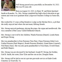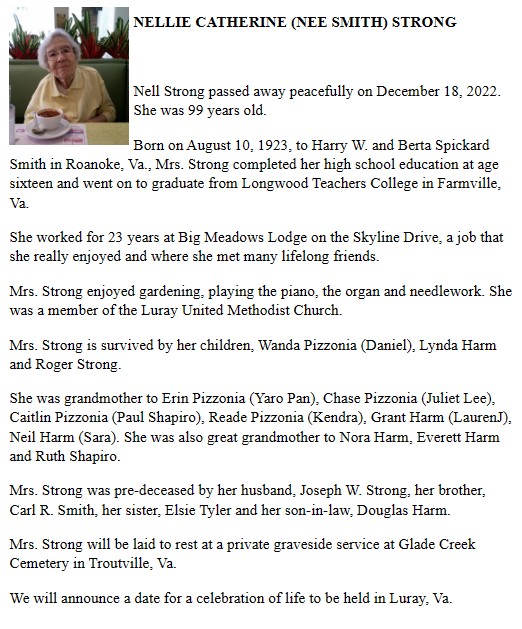- Nellie Catherine Smith Strong was born in 1923 in Roanoke to Harry W. and Berta Spickard Smith. She married Joseph Strong. They had three children together: Wanda Pizzonia, Lynda Harm, and Roger Strong. Nellie Strong died on December 18, 2022, and is buried in Glade Creek Cemetery.