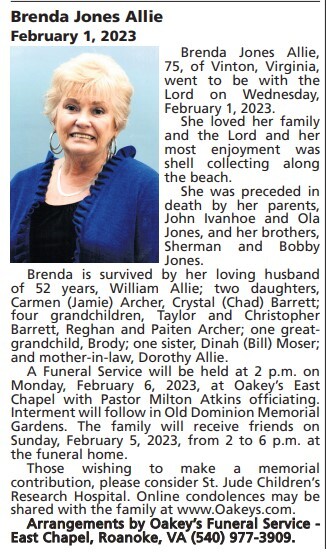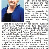 - Brenda Allie was born to John Ivanhoe and Ola Jones. She married William Allie. They had two children, Carmen and Crystal. Brenda Allie died on February 1, 2023, and is is buried in Old Dominion Memorial Gardens.