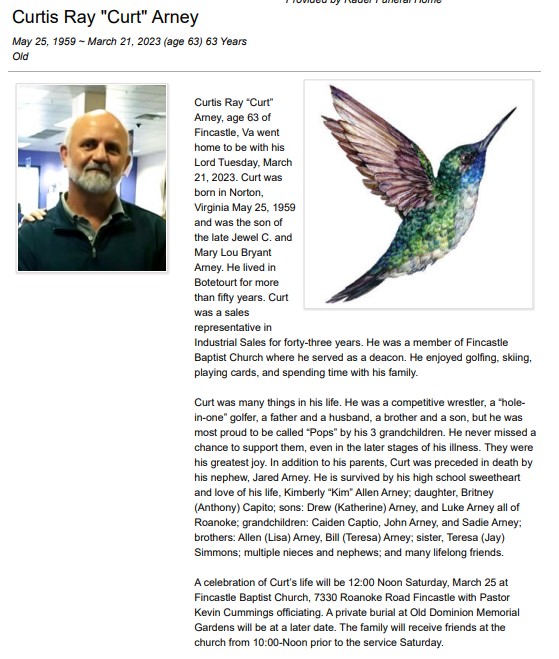 - Curtis "Curt" Ray Arney was born in Norton, Virginia in 1959 to Jewel C, Arney and Mary Lou Bryant Arney. He married Kimberly Allen Arney. They had three children together: Britney Capito, Drew, and Luke. Curtis Arney died on March 21, 2023, and is buried in Old Dominion Memorial Gardens.