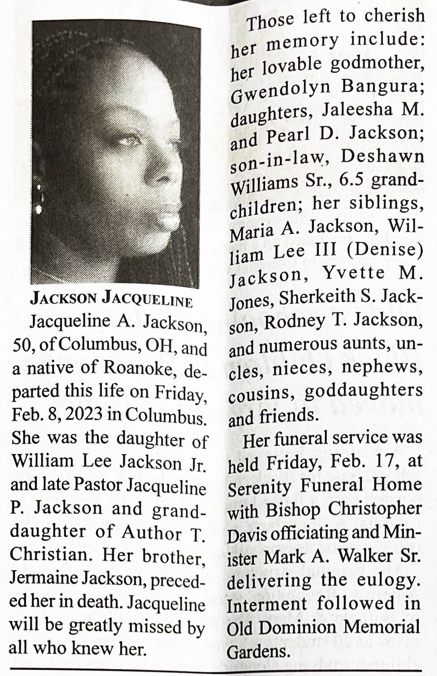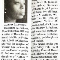 - Jacqueline A. Jackson was born in 1973 in Roanoke to William Lee Jackson Jr. and Pastor Jacqueline P. Jackson. She had two daughters Jaleesha M. and Pearl D. Jacqueline Jackson died on February 8, 2023, and is buried in Old Dominion Memorial Gardens.