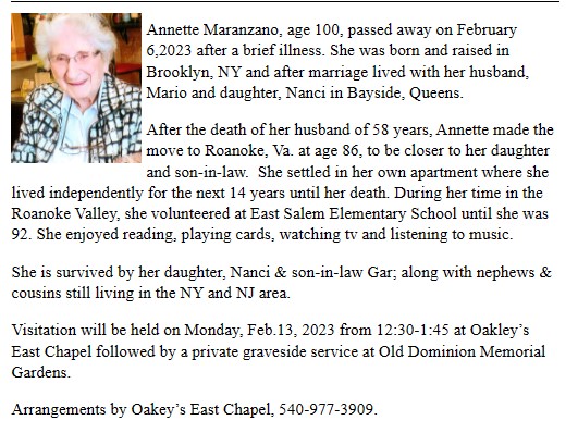 - Annette Maranzano was born in Brooklyn. She was married to Mario. They had one daughter, Nanci. Annette Maranzano died on February 6, 2023, and is buried in Old Dominion Memorial Gardens.