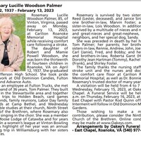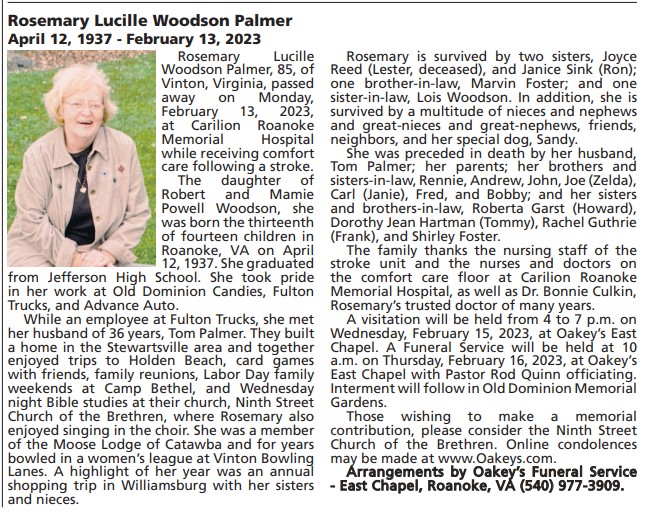 - Rosemary Lucille Woodson Palmer was born in Roanoke in 1937 to Robert Woodson and Mamie Powell Woodson. She married Tom Palmer. Rosemary Palmer died on February 13th, 2023, and is buried in Old Dominion Memorial Gardens.