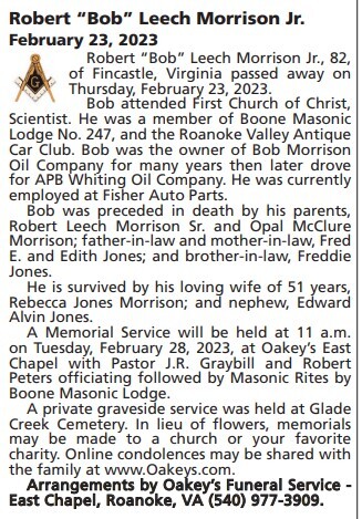 - Robert "Bob" Leech Morrison Jr. was born to Robert Leech Morrison Sr. and Opal McClure Morrison. He was married to Rebecca Jones Morrison. Robert Morrison Jr. died on February 23rd, 2023, and is buried in Glade Creek Cemetery.