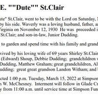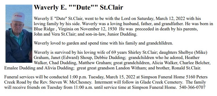 - Waverly E. "Dute" St. Clair was born in Blue Ridge in 1930 to John St. Clair and Vera St. Clair. He was married to Shirley St.Clair. They had 3 daughters: Shelbye Graham, Janet Shoup, and Debbie Dudding. Waverly St. Clair died on March 12th, 2022, and is buried in Glade Creek Cemetery.