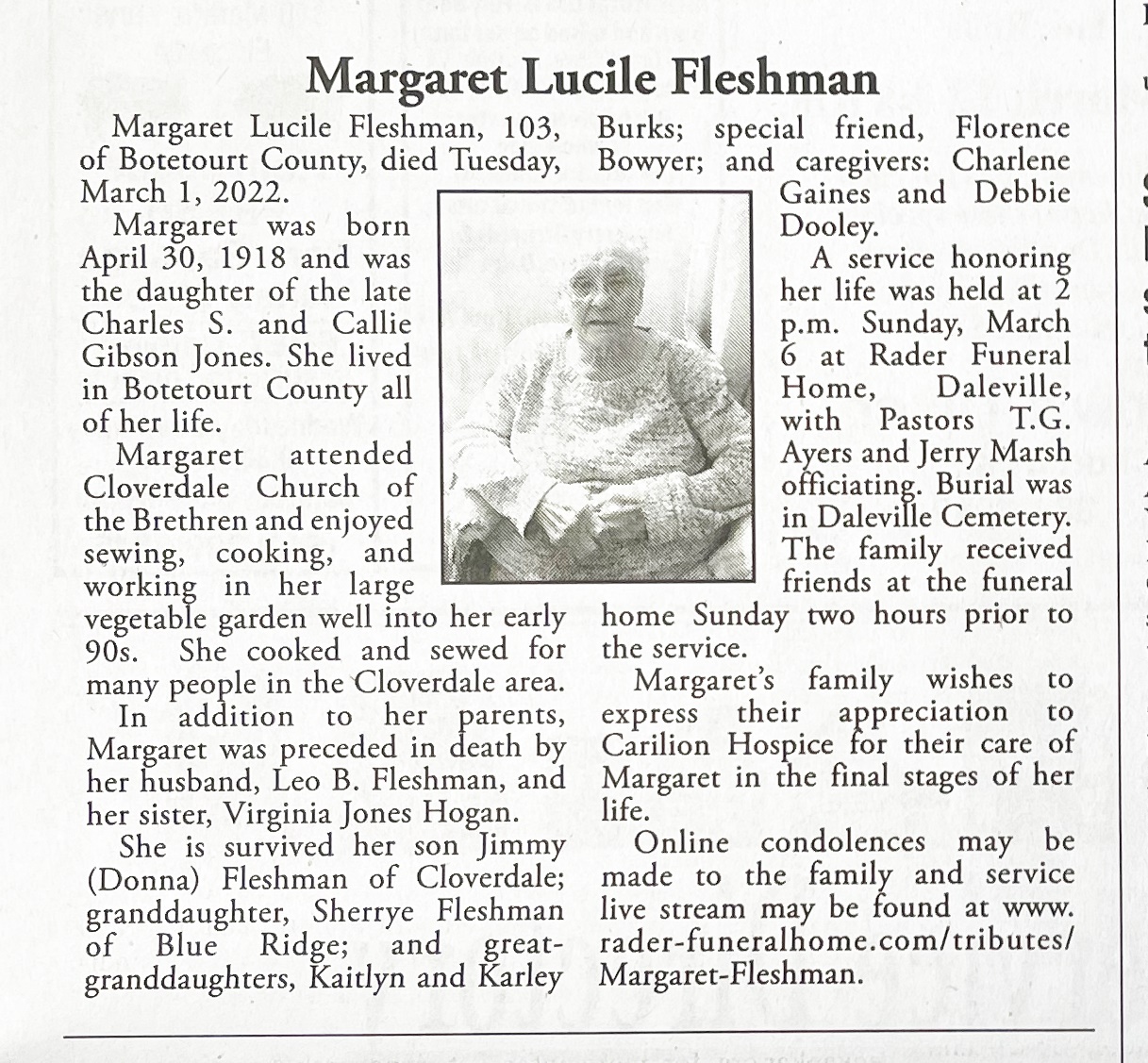 - Margaret Fleshman was born on April 30, 1918 in Botetourt County to Charles S. Jones and Callie Gibson Jones. She married Leo B. Fleshman. They had one son, Jimmy. Margaret Fleshman died on March 1st, 2022, and is buried in Daleville Cemetery.