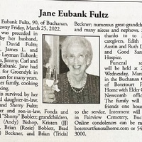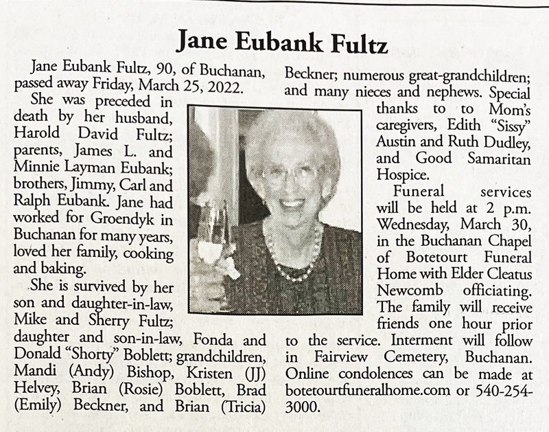 - Jane Fultz was born to parents James L. Fultz and Minnie Layman Eubank. She married Harold Fultz. They had two children together, Mike and Fonda. Jane Fultz died on March 25th, 2022, and is buried in Fairview Cemetery. She resided in Buchanan at the time of her death.