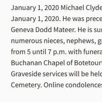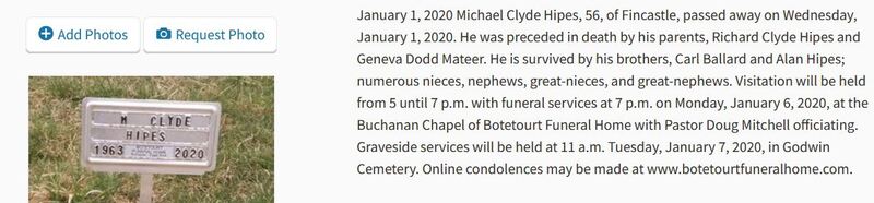 - Michael Clyde Hipes was born in 1963 to Richard Clyde Hipes and Geneva Dodd Mateer. He died on January 1st, 2020, a resident of Fincastle, and is buried in Godwin Cemetery.