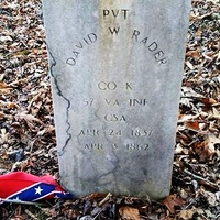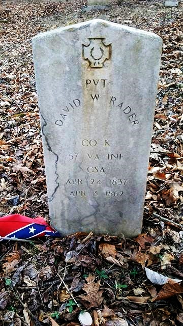 - David W. Rader was born April 24, 1837 to Benjamin Franklin Rader and Harriet Wysong Rader. He married Ellen C. McKallister Knowles. He died April 3, 1862, and is buried at Godwin Cemetery. His headstone indicates he served in the Confederate Army as private in Company K, 57th VA Infantry.