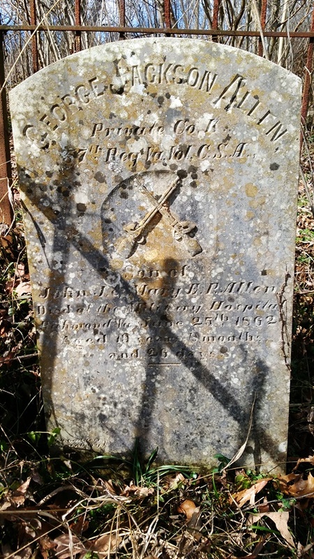 - George Jackson Allen was born September 25, 1843 to John James Allen and Mary Elizabeth Payne Jackson Allen. He served in the Confederate Army and died June 25, 1862. He is buried at Allen Cemetery.
