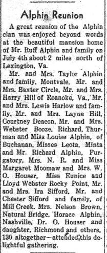 A great reunion of the Alphin clan was enjoyed beyond words at the beautiful mansion home of Mr. Ruff Alphin and family on July 4th about 2 miles north of Lexington, Va.