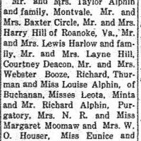 Mr. and Mrs. Taylor Alphin and family, Montvale. Mr. and Mrs. Baxter Circle, Mr. and Mrs. Harry Hill of Roanoke, Va., Mr. and Mrs. Lewis Harlow and family, Mr. and Mrs. Layne Hill, Courtney Deacon, Mr. and Mrs. Webster Booze, Richard Thurman and Miss Louise Alphin, of Buchanan, Misses Leota, Minta and MR. Richard Alphin, Purgatory, Mrs. N. R. and Miss Margaret Moomaw and Mrs. W. O. Houser, Miss Eunice and Lloyd Webster Rocky Point, Mr. and Mrs. Ira Sifford, Mr. and Chester Sifford and Family, of Mill Creek, Mrs. Nelson Brown, Natural Bridge, Horace Alphin, Nashville, Dr. O. Houser and daughter, Richmond and others, 130 altogether-attended this delightful gathering." - Creator
