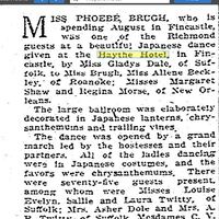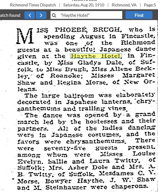 - Image 6 - A newspaper article from the Richmond Times Dispatch, dated August 20, 1910, reporting on a dance held at the Haythe Hotel.