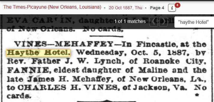 - Image 8 - a newspaper article from the Times-Picayune dated October 29, 1887, reporting on a wedding at the Haythe Hotel.