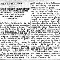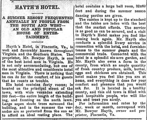 Hayth's Hotel, in Fincastle, Va., is well and favorably known throughout Virginia and the Southern States. The proprietor, Mr. Bowyer Hayth, is one of the best hotel men in Virginia. He is not only accommodating, but one of the most attentive and considerate hotel men in Virginia. There is nothing that he can do for the comfort of his guests that he counts as trouble.
