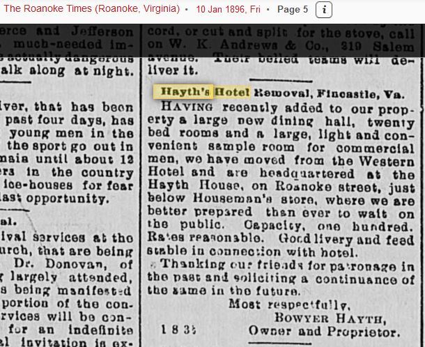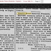 - Image 2 - A notice from the Roanoke Times, dated January 10, 1896, describing a move and expansion of the Hayth's Hotel.