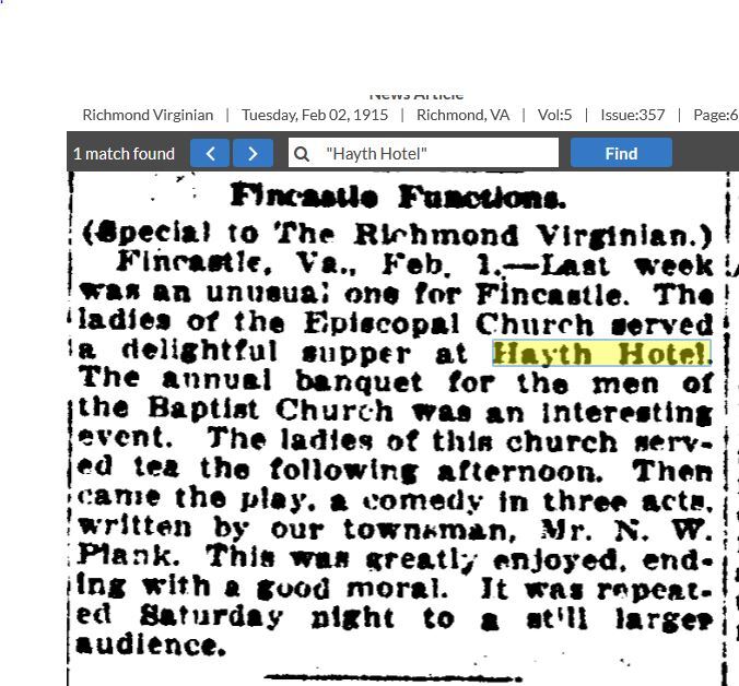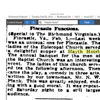 For information and rates by the day, week or month, correspond with Mr. Bowyer Hayth, owner and proprietor, Fincastle, Va." - Image 4 - A newspaper article from the Richmond Virginian, dated February 2, 1915, which mentions a supper held at the Hayth Hotel, served by the ladies of the Episcopal Church.