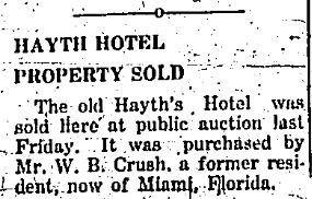 The old Hayth's Hotel was sold here at public auction last Friday. IT was purchased by Mr. W. B. Crush, a former resident, now of Miami, Florida." - Creator