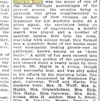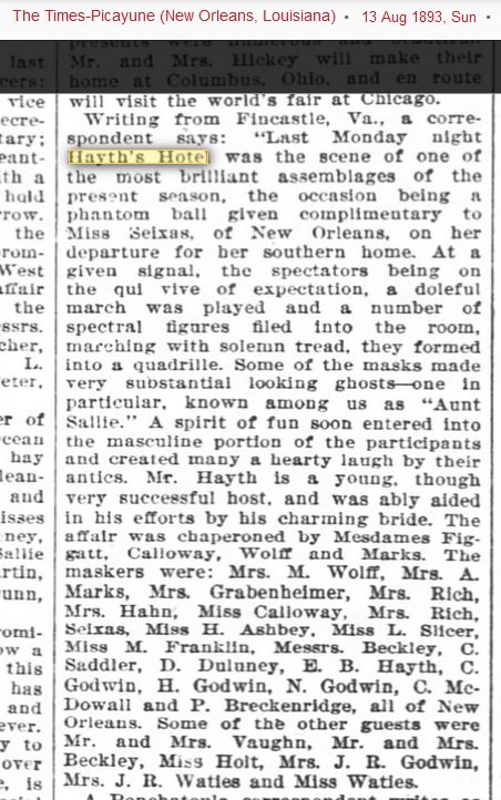 - Image 1 - A news article from the Time's-Picayune of New Orleans, dated August 13, 1893, which describes a ball held at the Hayth's Hotel in 1893. People in attendance included Ms. Figgatt, Ms. Claloway, Ms. Wolff, Ms. Marks, Mrs. M. Wolff, Mrs. A. Marks, Mrs. Grabenheimer, Mrs. Rich, Mrs. Hahn, Miss Calloway, Mrs. Rich, Miss Seixas, Miss H. Ashbey, Miss L. Slicer, Miss M. Fanklin, Mr. Beckley, Mr. C. Saddler, Mr. D. Duluney, Mr. E> B. Hayth, Mr. C. Godwin, Mr. H. Godwin, Mr. N. Godwin, Mr. C. McDowall, Mr. P. Breckenridge, Mr. and Mrs. Vaughn, Mr. and Mrs. Beckley, Miss Hold, Mrs. J. R. Godwin, Mrs. J. R. Waties,a nd Miss Waties.