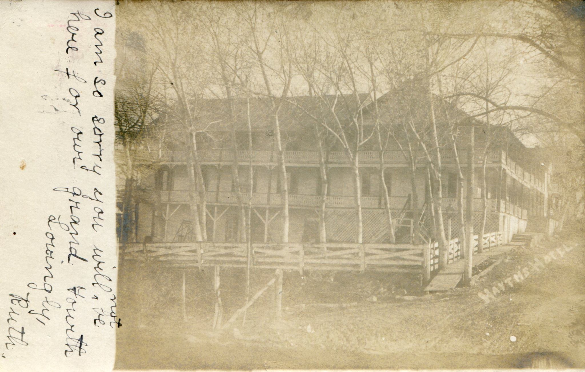 - Image 9 - a sepia postcad of the Hayth Hotel. A handwritten message reads, "I am so sorry you will not be here for our grand fourth. Lovingly, Ruth."