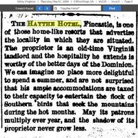 - Image 5 - A newspaper article from the Valley Virginian, dated May 1, 1884, praising the "Haythe Hotel."