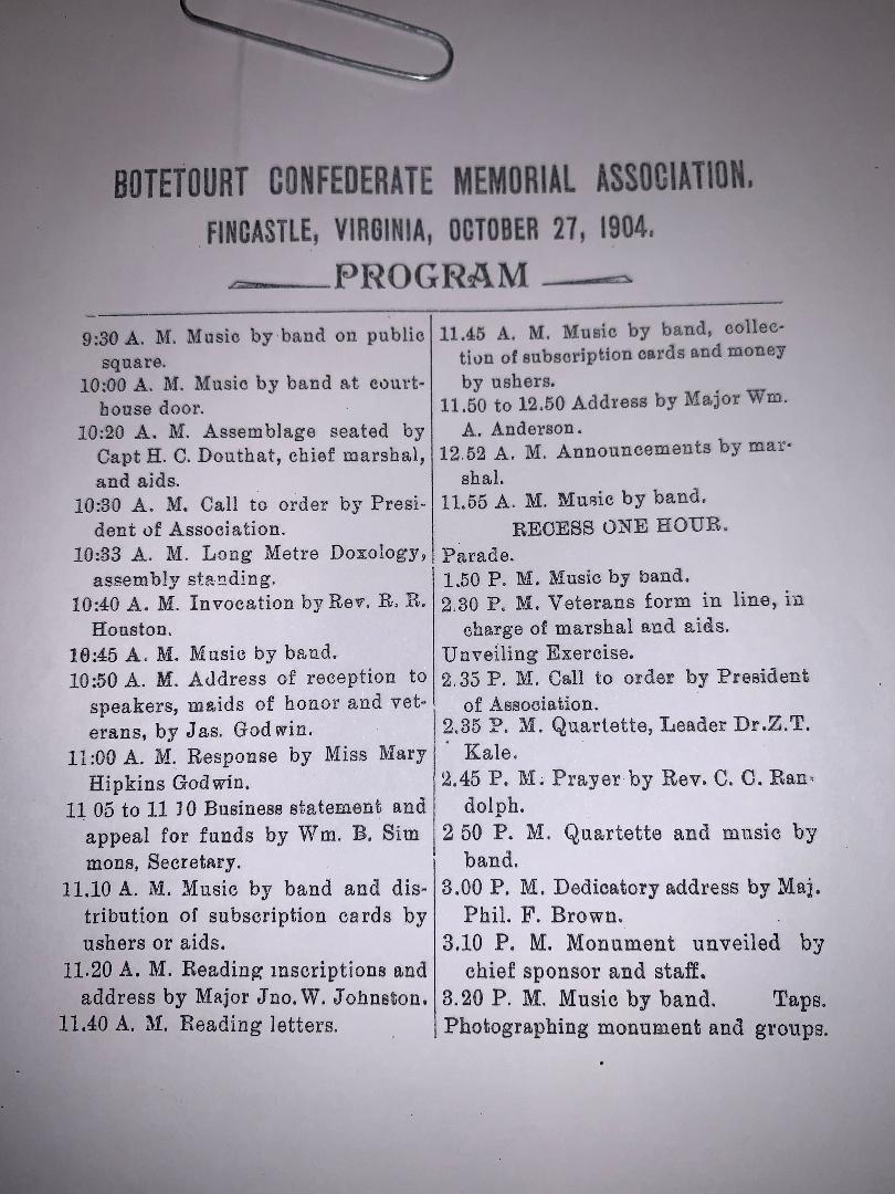 - A program from the Botetourt Confederate Memorial Association monument unveiling on October 27, 1904 in Fincastle.